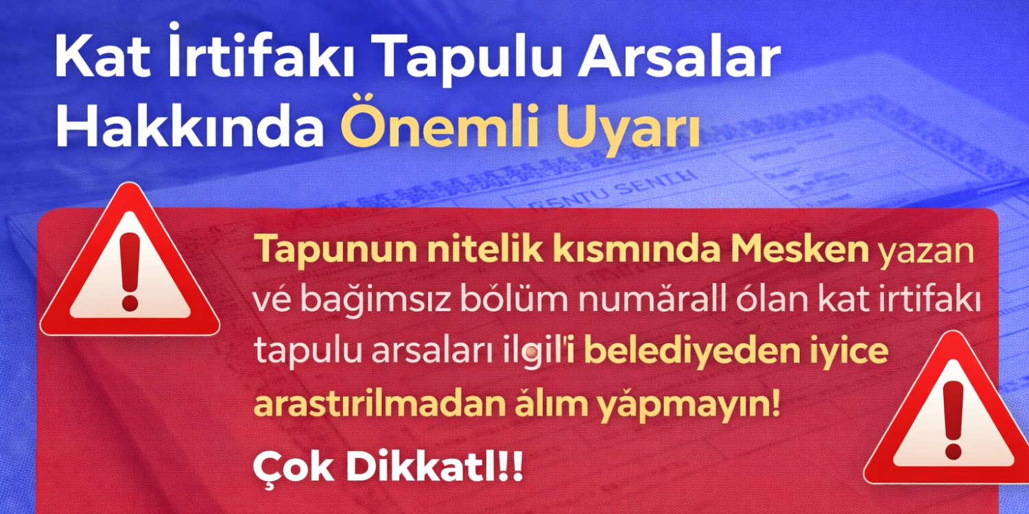 Tapunun nitelik kısmında Mesken yazan ve bağımsız bölüm numarası bulunan kat irtifakı tapulu arsalar, mutlaka ilgili belediyeden detaylı şekilde araştırılmadan satın alınmamalıdır.
